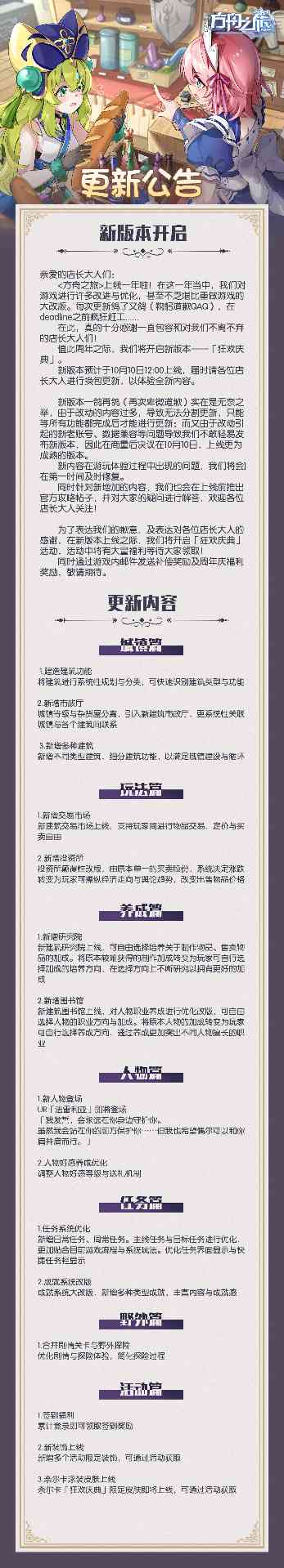方舟之旅新版本「狂欢庆典」10月10号上线 日期: 2026-03-21 06:10:28 栏目:最新攻略 浏览: 方舟之旅新版本「狂欢庆典」10月10号上线如下: 以上就是方舟之旅新版本「狂欢庆典」10月10号上线相关内容。 标签: 上一篇:方舟之旅9月14日更新补充公告 下一篇:方舟之旅合并服务器公告 相关推荐 香肠派对【超新星地图攻略】地图全面讲解ID:6s86mc 忍者必须死3忍3 秘卷相关问题Q&A(4.11更新) 策马守天关《策马守天关》军团新副本『登峰崎路』阵容推荐 忍者必须死3清点了一下四象至今的秘卷(甲)