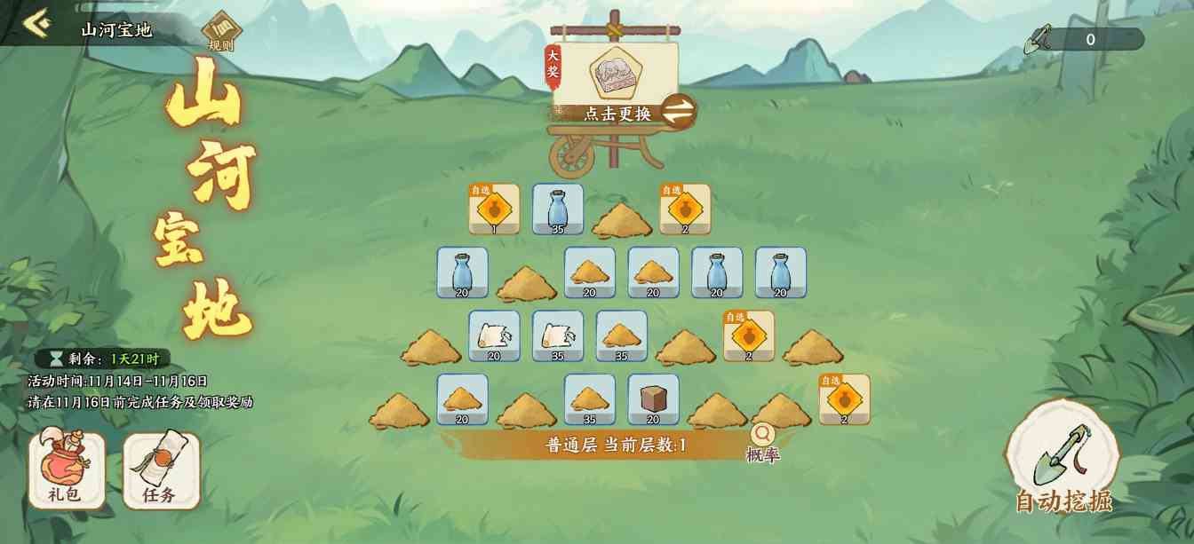 注意提前更改自己想要的普通层和特殊层大奖,挖到大奖可以提前进入下一层,每5层1次特殊层,特殊奖励大奖可选天品文物碎片。