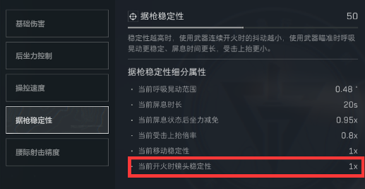 其次就是关于【开火时枪身稳定性】和【开火时视野稳定性】这两个词条了,前者我们在属性面板当中是可以看到的,它是与后坐力控制当中的【当前开火时武器稳定性】相关的。
