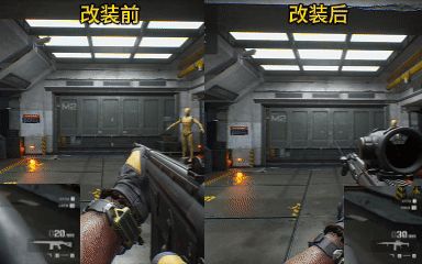 从图中可以看出,经过改装的,开镜速度加快,且瞄准镜支持不同倍率的切换,适合更多不同的战场环境,弹匣换成了30发弹夹,续航进一步增强!