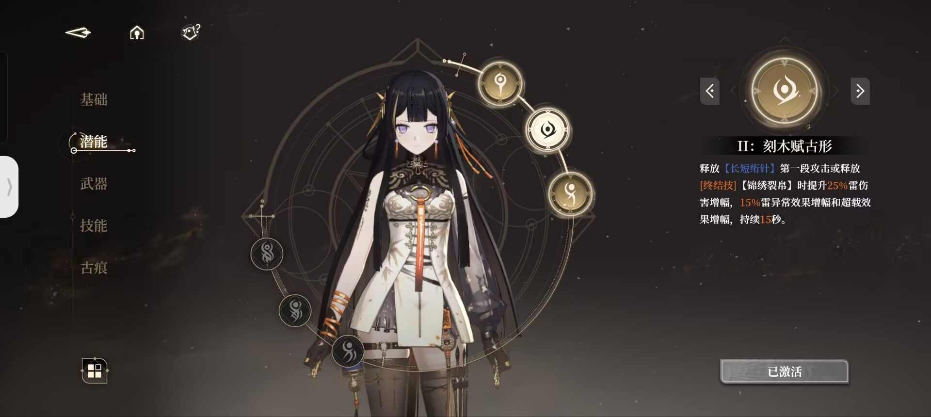 通俗来讲即一技能或二技能的二阶段,当郁离持有不同印记后,我们的技能使用时会随之转化。