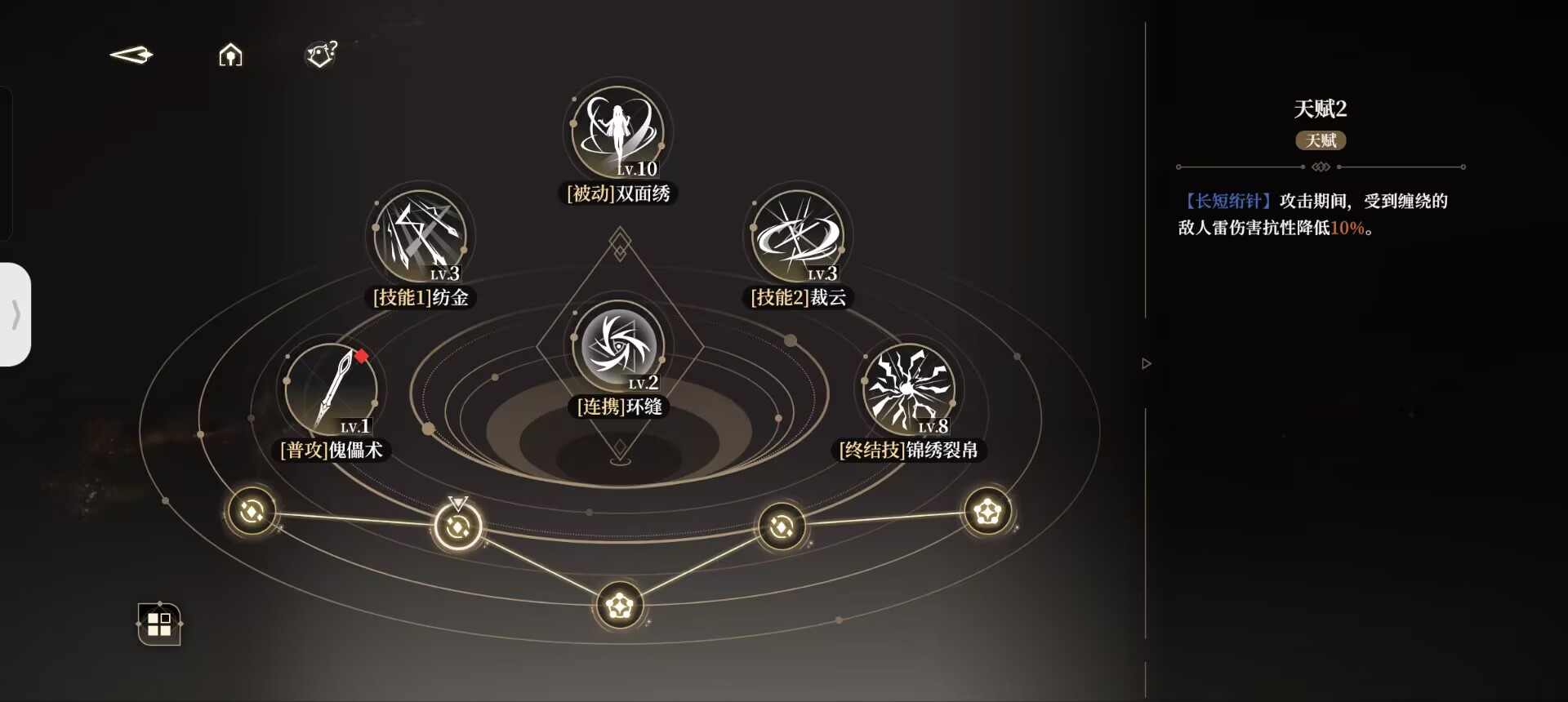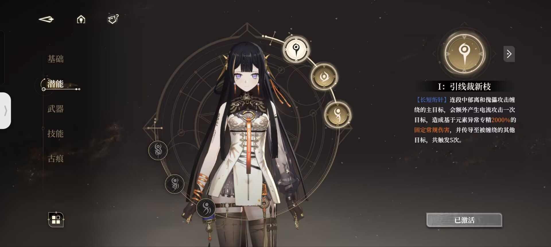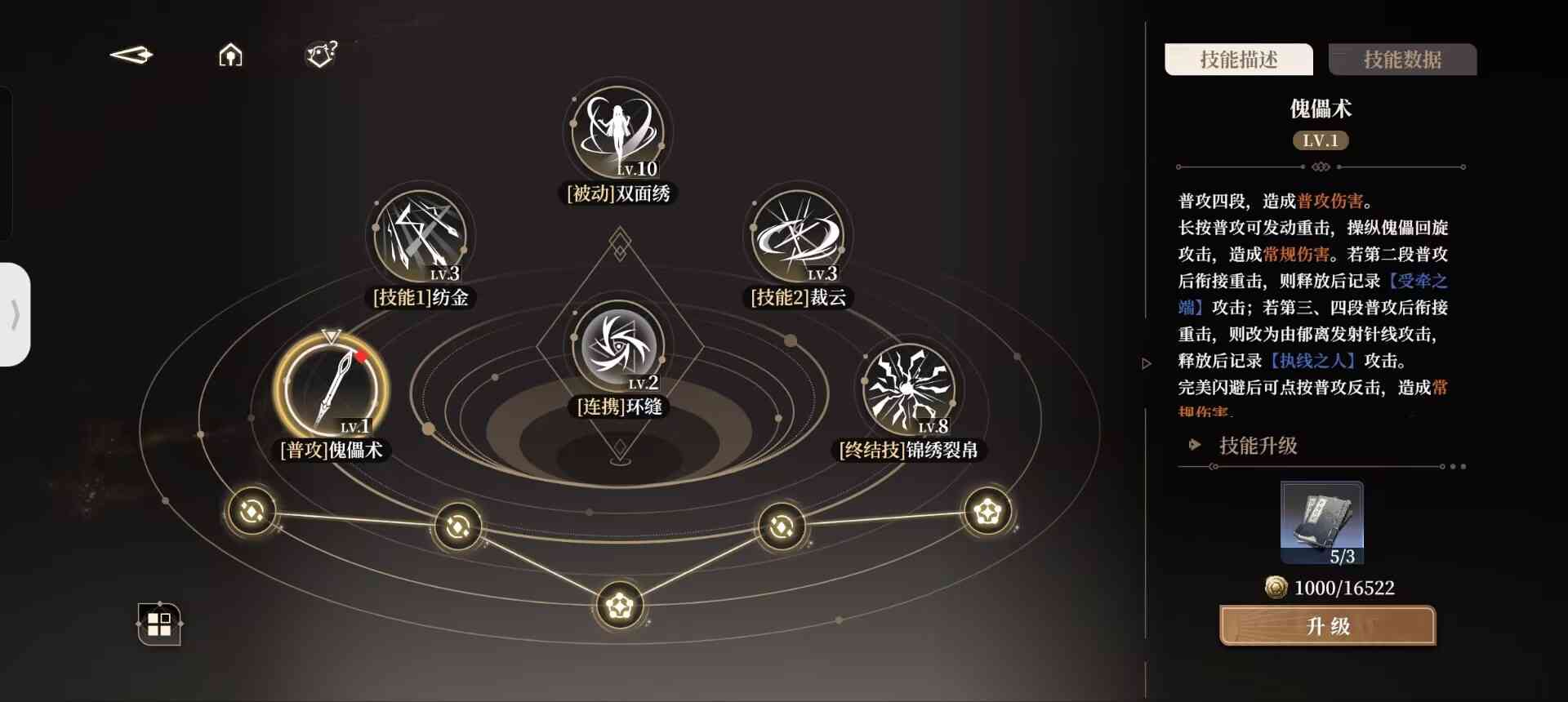 我们在使用过一技能后,会持有小郁离的印记,即【执线之人】。此时二技能则会转变为被动中的【操纵秘术】。同理,我们在使用过二技能以后,便会持有傀儡即大郁离的印记,即【受牵之端】,此后使用的一技能则会变为【螺旋绣术】。