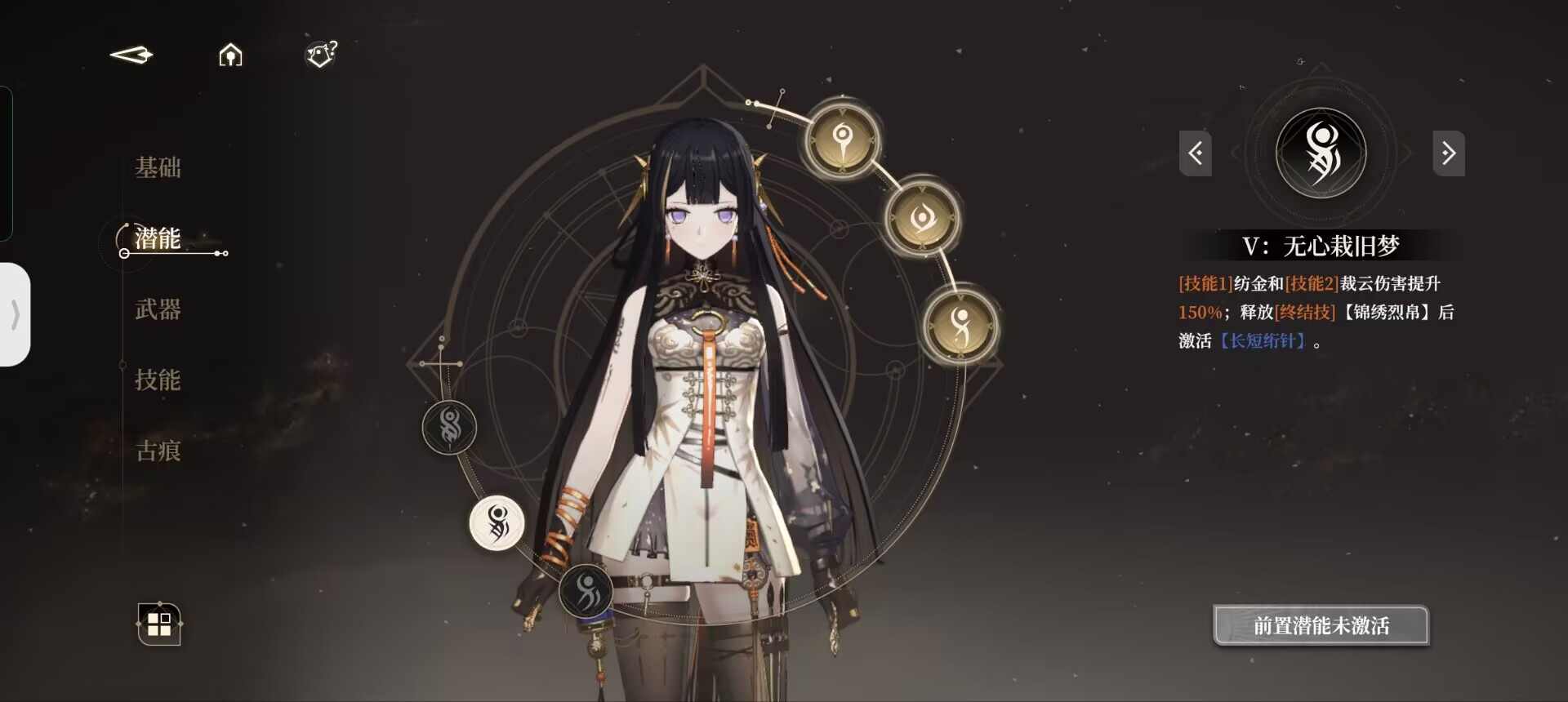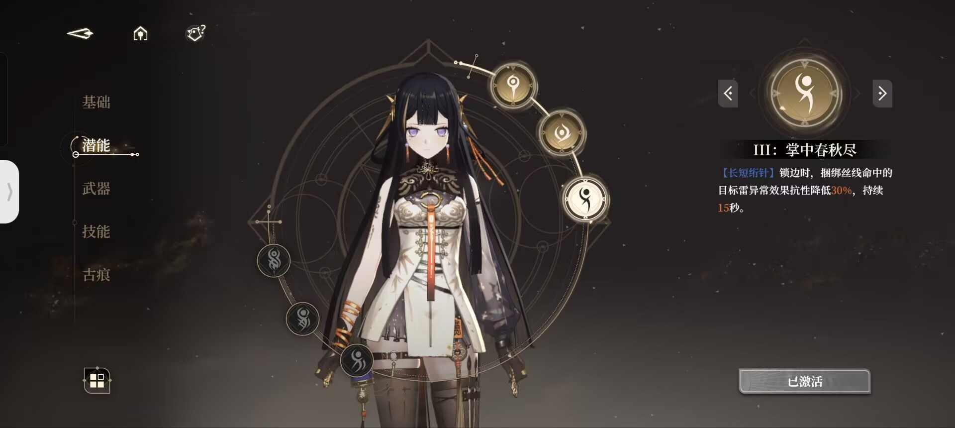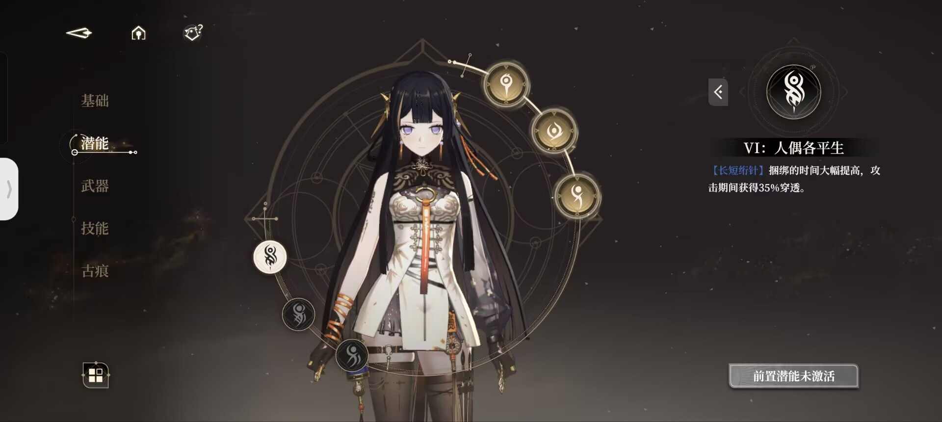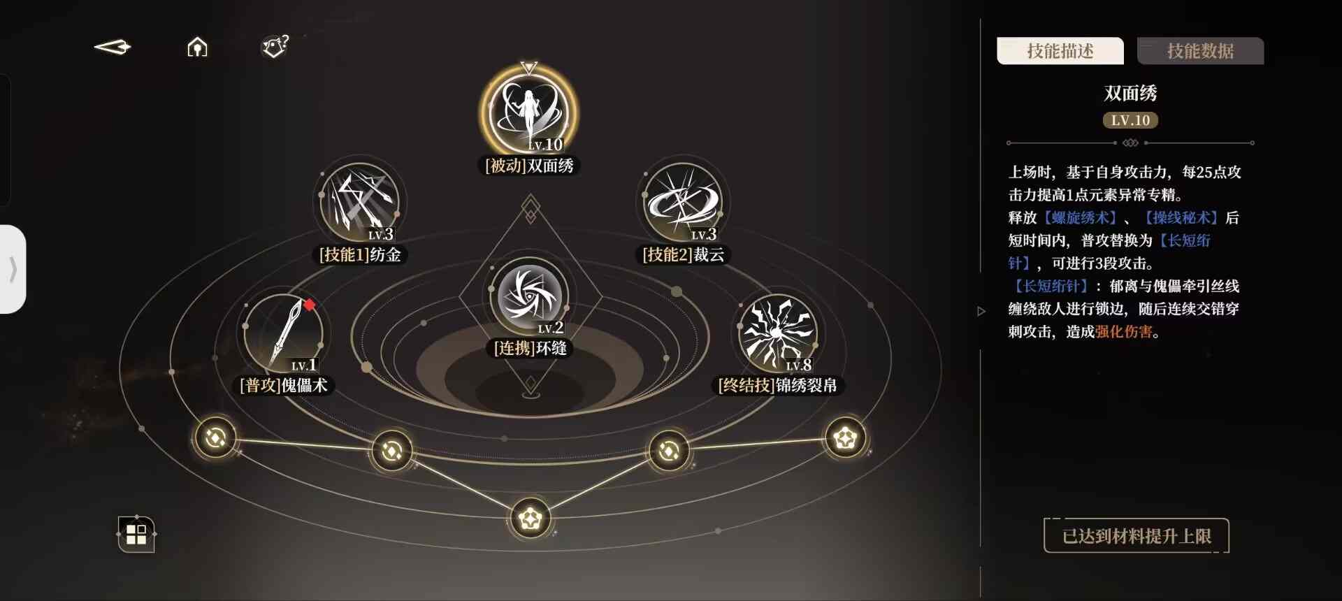 我们在使用过一技能后,会持有小郁离的印记,即【执线之人】。此时二技能则会转变为被动中的【操纵秘术】。同理,我们在使用过二技能以后,便会持有傀儡即大郁离的印记,即【受牵之端】,此后使用的一技能则会变为【螺旋绣术】。
