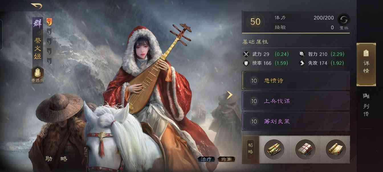 蔡文姬战法:悲愤诗+上兵伐谋+筹划良策。韬略库:胡笳十八拍(专属)+避勇善本+兵情善本。重盾兵不屈,专精点亮屹然不动。此战摆出的是雁形阵,貂蝉和邹婶娘联合组成前排防线。负责嘲讽的是貂蝉,因为她是最能扛异形揍的,邹婶娘则是负责缴械,曹操和典韦的心理阴影被她整爆了。