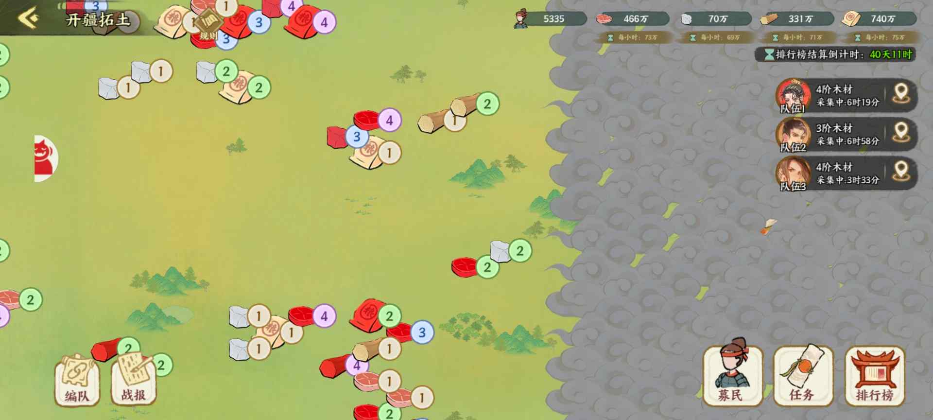 (1)地图上散布着石头、木材、肉、粮这四种基础资源坑位,等级越高,单位时间的产出量越大。(如下图所示)