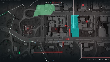 有了上面的理论分析作为指导,那么我们的进攻思路也就清晰明了。我们在从A转B的倒计时阶段就可以在地图下方的区域做准备了。等待倒计时结束之后就可以从房子中间的胡同直接翻墙进入B2区域,然后再想办法进入房顶。