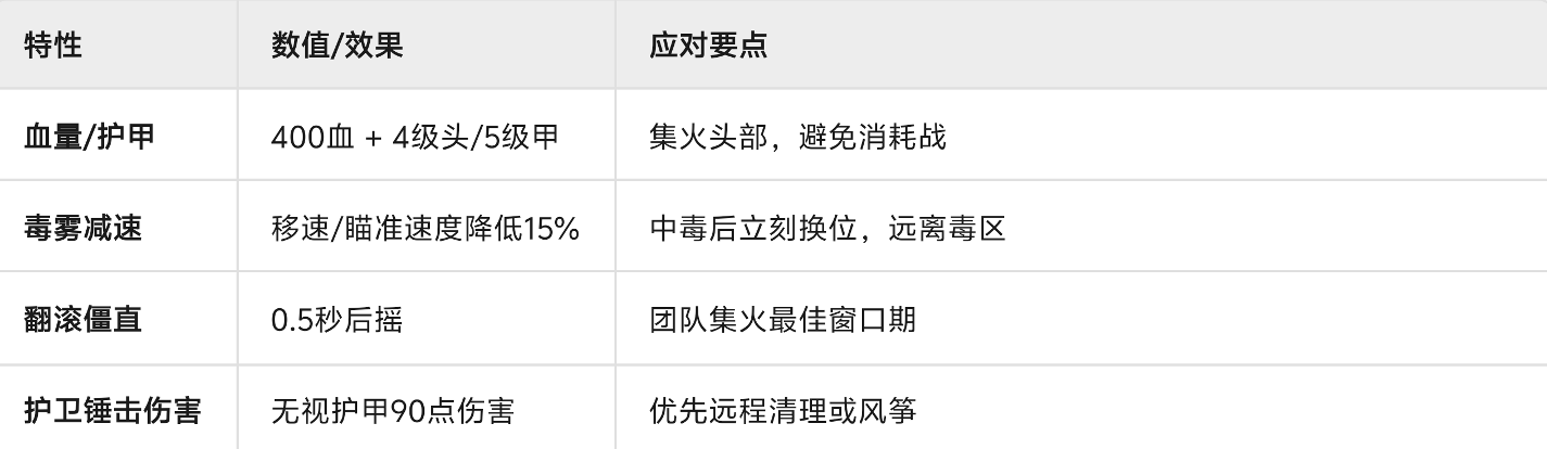 迷幻毒雾:渡鸦投掷必中黄色毒雾,降低玩家15%移速和瞄准速度(无直接伤害),中毒后需立刻拉开距离换位。