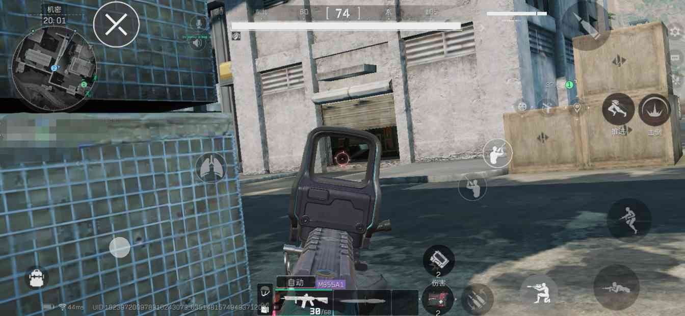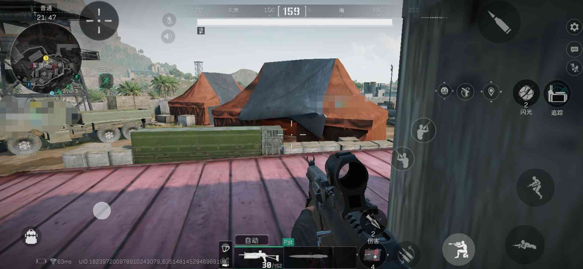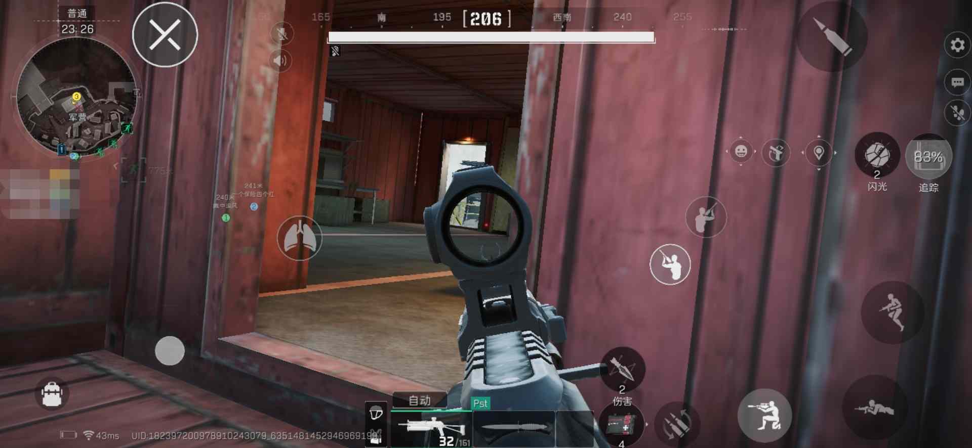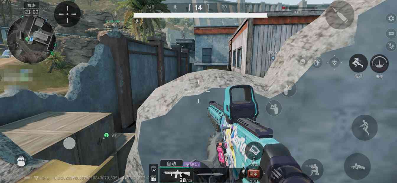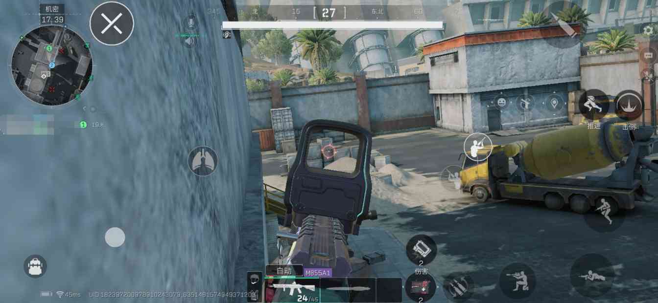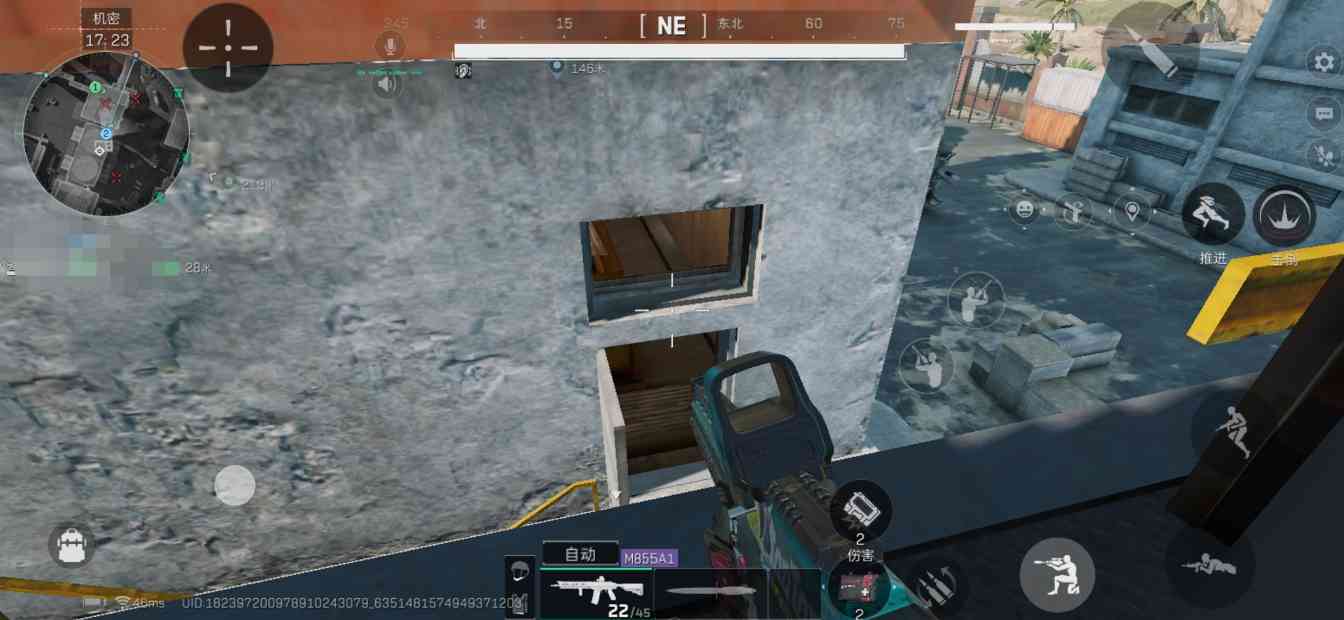 翻墙上来点位墙边会有沙袋比较厚实,那个墙体非常的厚,推荐可以贴墙,直架时注意收集对方信息以及军营大门人机动向,因为我们留了盾哥帮我们守住管道大门口的斜坡所以即使有人冲锋我们也可以第一时间反应。