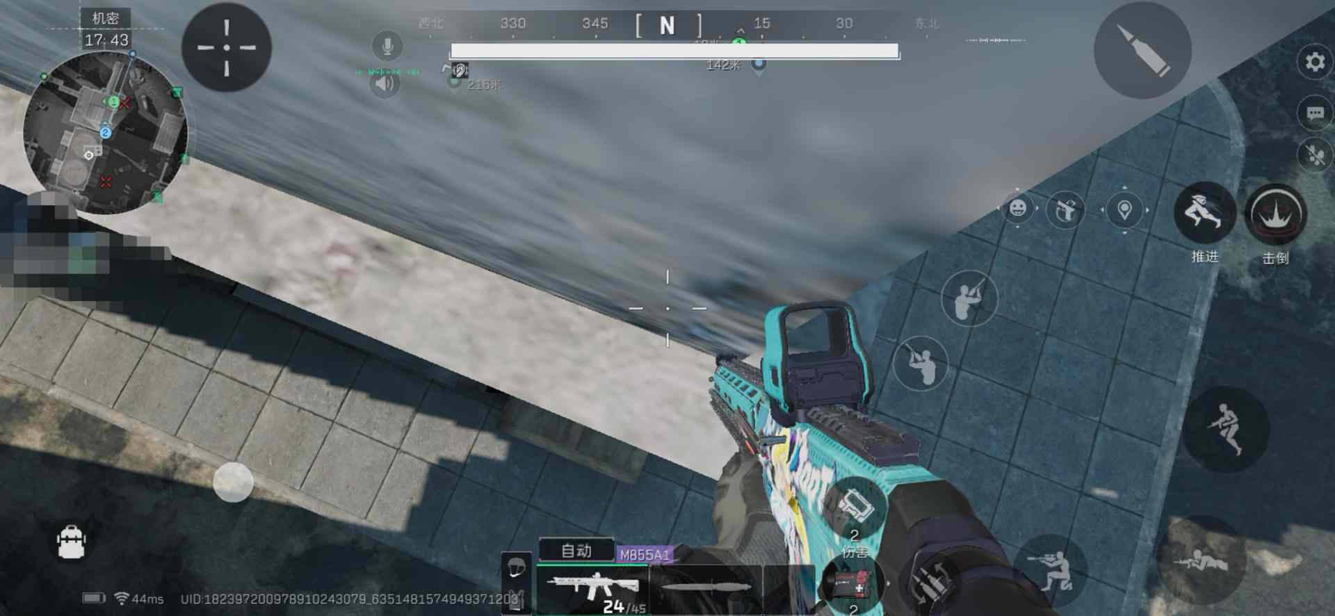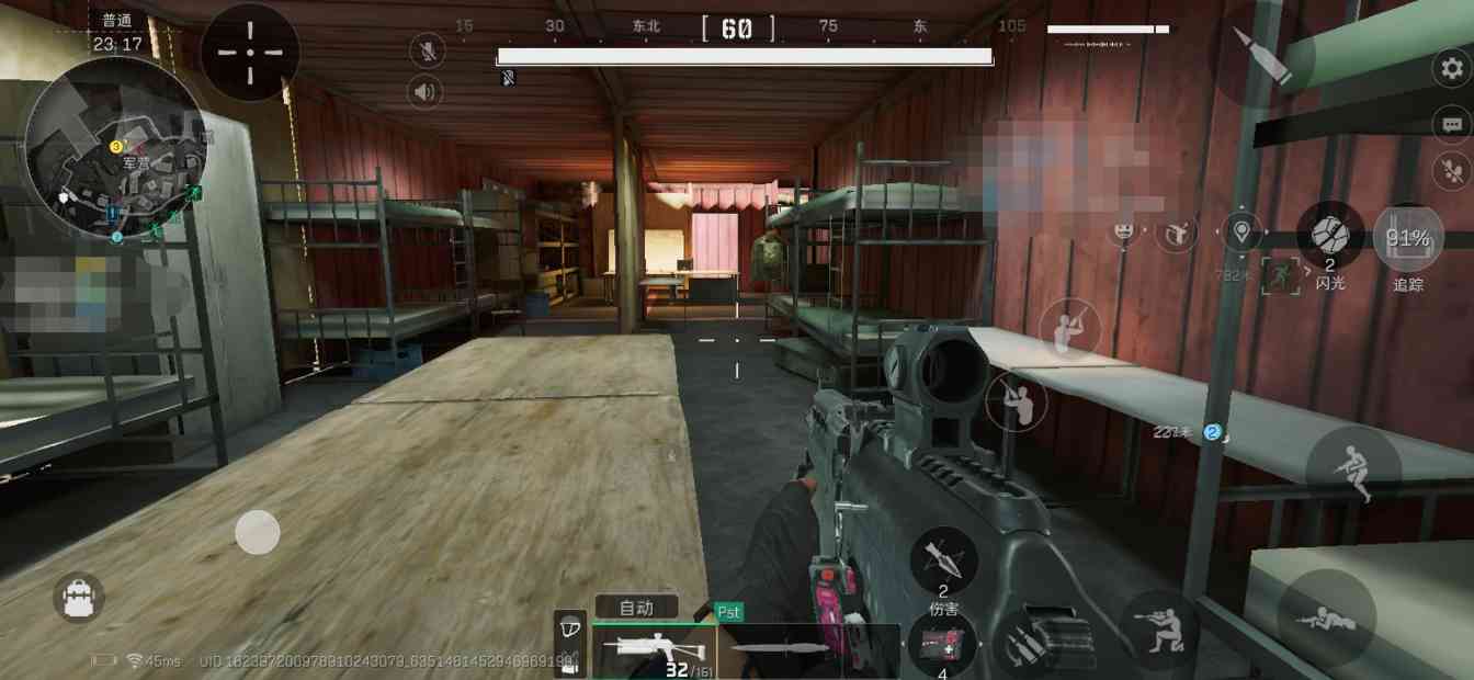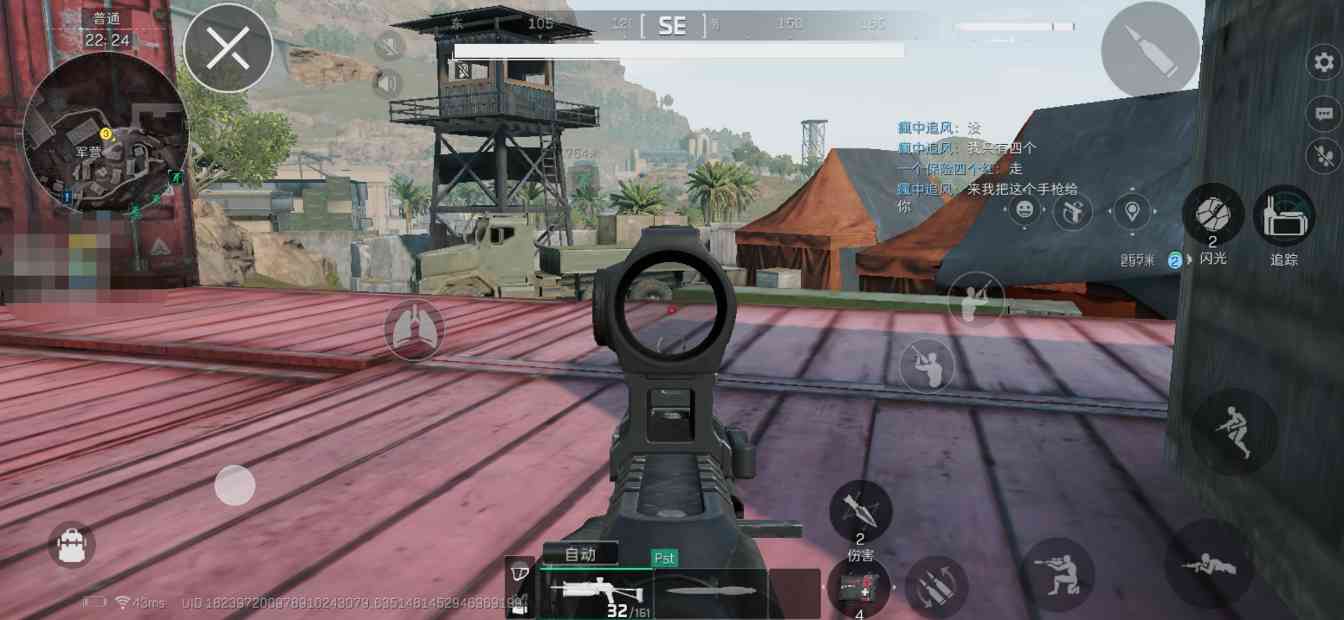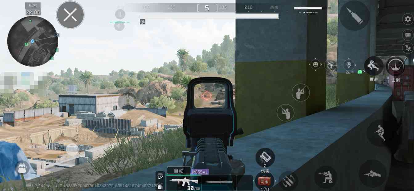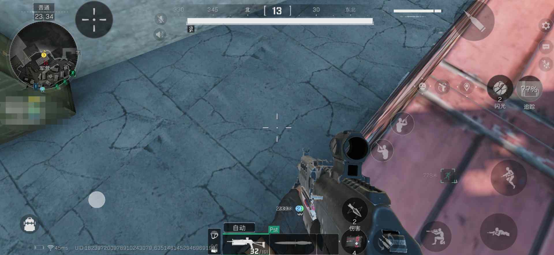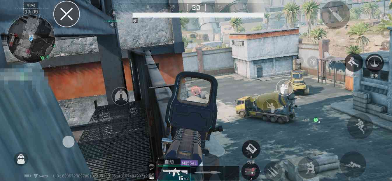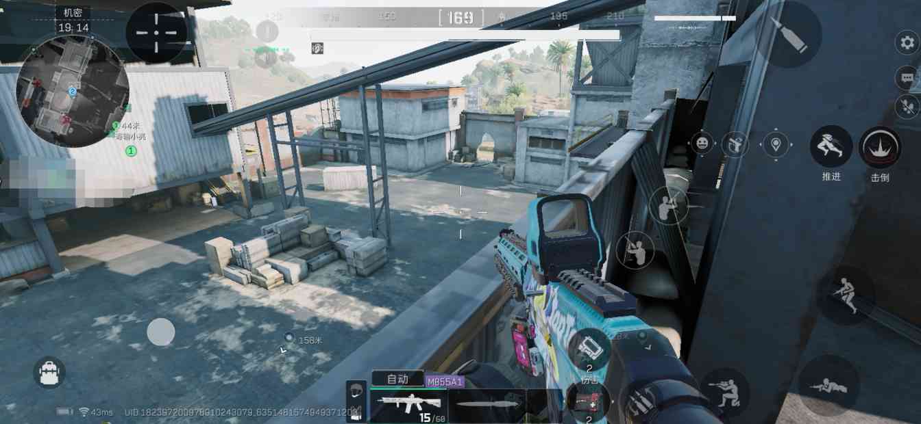 翻墙上来点位墙边会有沙袋比较厚实,那个墙体非常的厚,推荐可以贴墙,直架时注意收集对方信息以及军营大门人机动向,因为我们留了盾哥帮我们守住管道大门口的斜坡所以即使有人冲锋我们也可以第一时间反应。