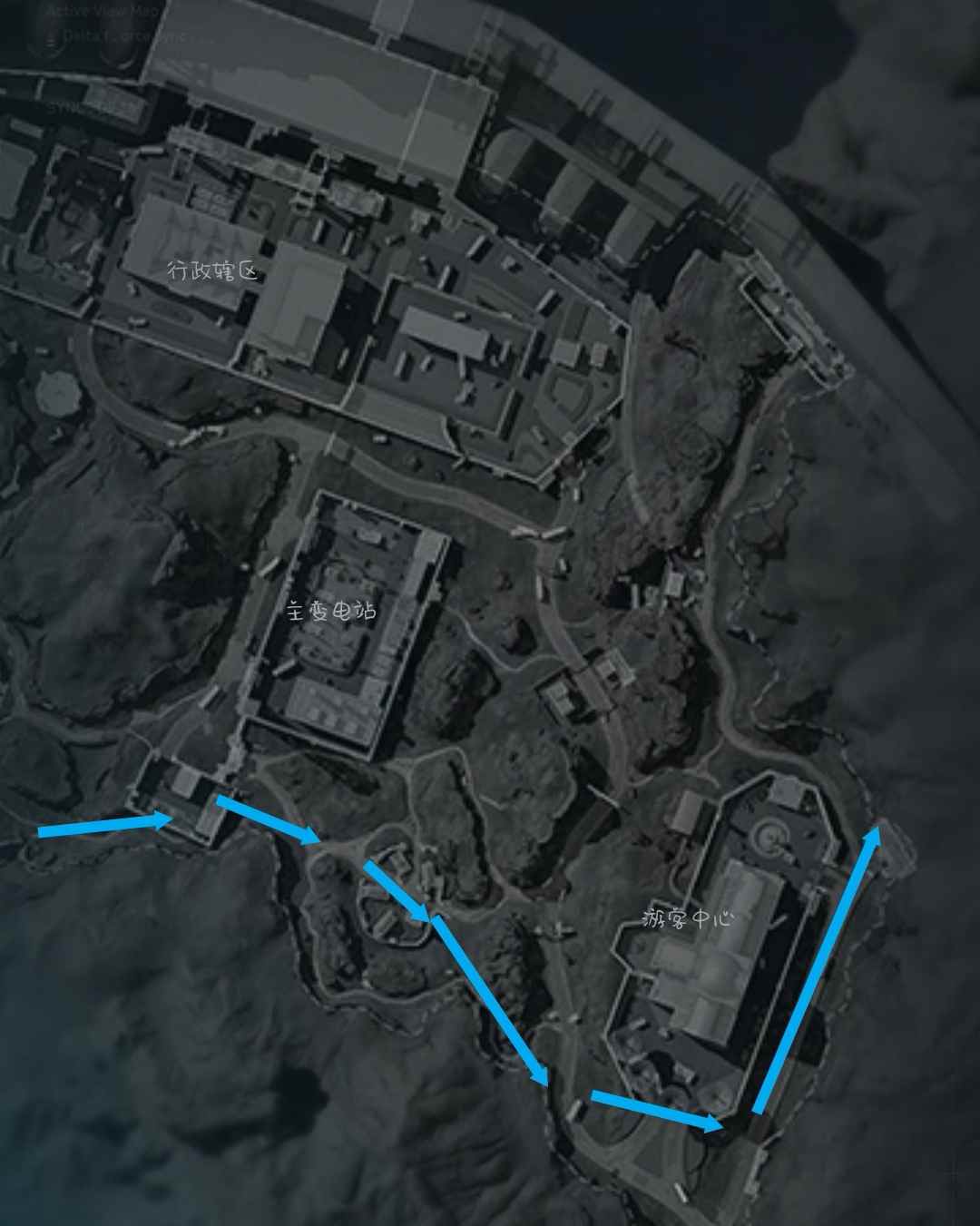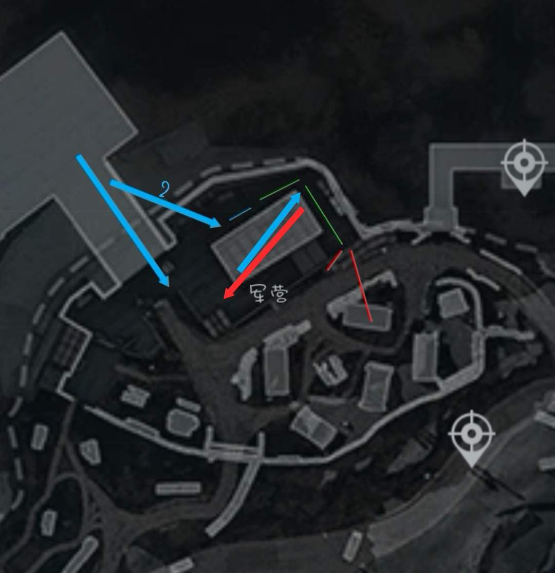 如果确定是往医疗箱跑的话,到我标注位置开始(有一个很明显的土山,不能攀爬不要漏信息)静步,稍微往前一步就会被听到。所以需要静步去摸,如果对方是翻墙直冲水泥厂那你也直冲水泥厂即可。