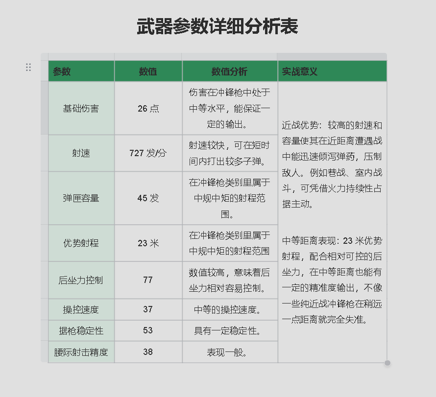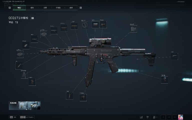 从数据种可以得出:QCQ171冲锋枪是一把综合性能较为均衡的枪械。它在近距离战斗中具备较强的压制力和持续输出能力,后坐力控制良好使其对不同水平玩家都有一定友好度。不过在远距离作战能力上有明显短板。适合喜欢近战冲锋、注重火力持续性和压制效果的玩家使用,在团队作战中可承担突进、近战火力支援等角色,是一把在特定作战场景(近战及部分中距离)能发挥出色的武器。