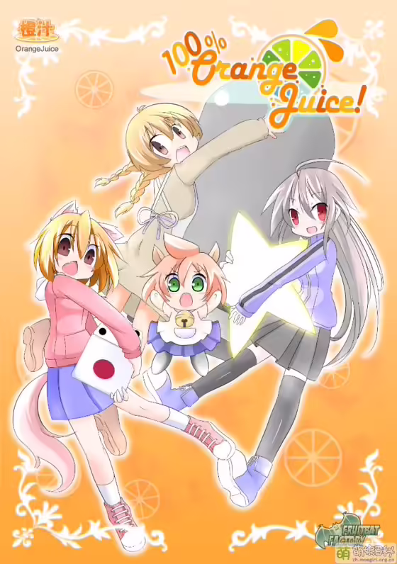 100% Orange Juice(100% 鲜橙汁)是橙汁系列作品全明星登场的桌面游戏。与来自 Flying Red Barrel(飞天红酒桶)、QP Shooting(QP 追击)、Suguri(疾旋战姬)、Sora(空旋战姬)各个作品里的角色,以及在本作中出现的新角色们,一起以获胜为目标使用骰子对战吧!